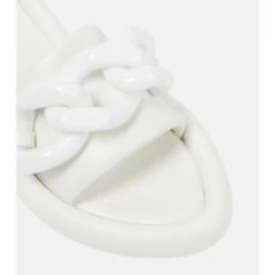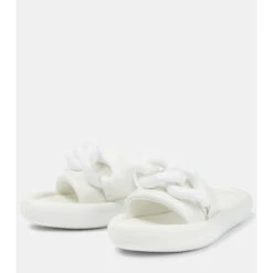 The Air Slide sandals were initially launched as part of Stella McCartney’s A to Z Manifesto Spring/Summer ’21 Collection. They feature tonal enamel chains and puffy soles made from the industrial waste materials of the factory they are made in.