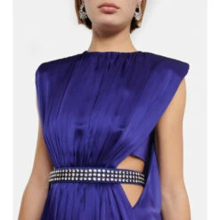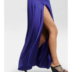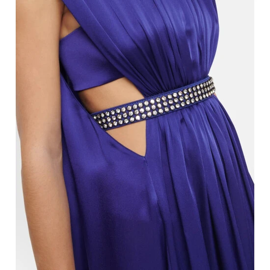 This Grecian-inspired satin gown from Stella McCartney features a high leg slit. A belt cinches the waist through the side cutouts and calls attention to the beautiful pleats running down the design.