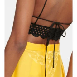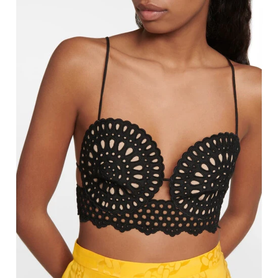 This Stella McCartney crop top is made from a flax and organically-cultivated cotton blend. It’s defined by intricate broderie anglaise embroidery, self-tie straps, and a scalloped hem.