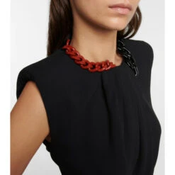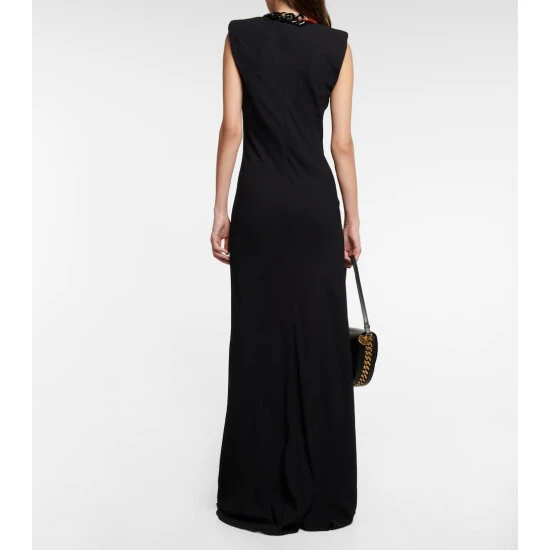 This gown from Stella McCartney comes with a surprising accent: a black and red chain that circles the neck. Inspired by the brand’s Falabella bags, the enameled hardware is woven through the neckline of this slim, full-length dress.