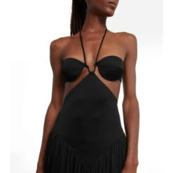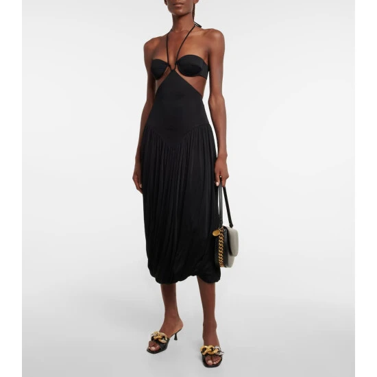 Stella McCartney presents us with the perfect contemporary LBD. Featuring a fitted top with molded cups and cutout details below the bust, it extends to a flowing pleated skirt.