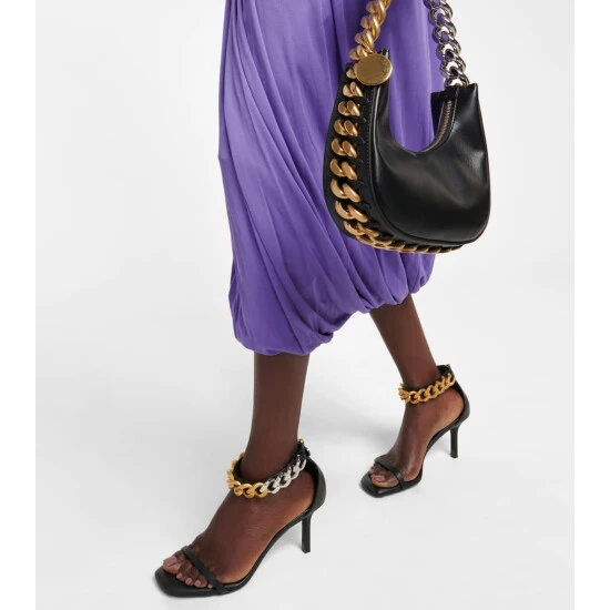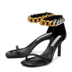 The Falabella high sandals from Stella McCartney are instantly recognizable by the chunky chain embellishment in front. They’re made in Italy with square open toes and leather soles set atop stiletto heels.