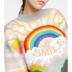 The Festive Smile sweater from Stella McCartney is intarsia-knit from a wool-blend in a long-sleeved and crewneck silhouette. It features a cheerful multicolored landscape and rainbow motif in front that’s captioned “smile”.