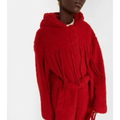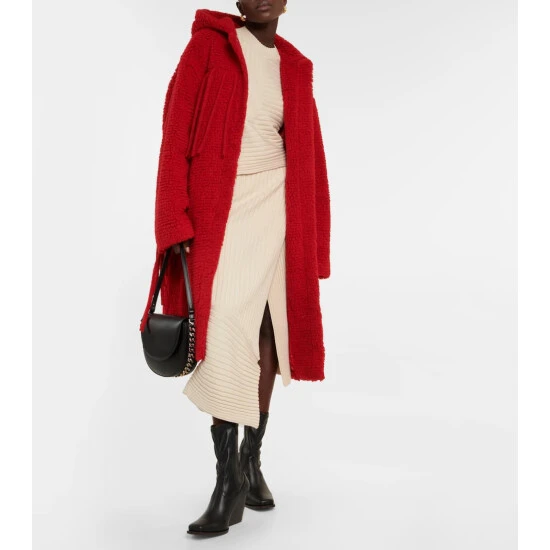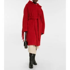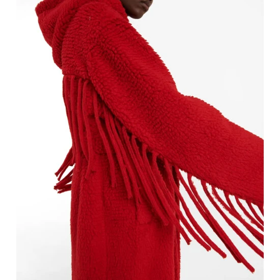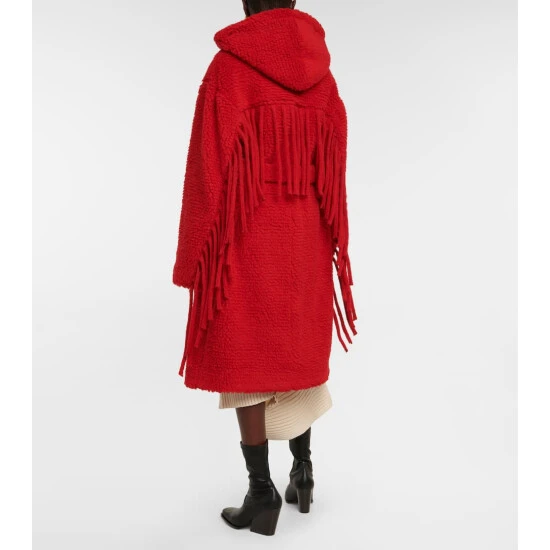 This coat from Stella McCartney is made from a tactile teddy fabric backed with insulating wool. The hooded design is trimmed with long fringes at places and cinches with a waist belt.