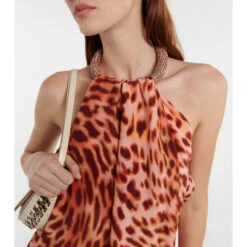 Make a glamorous statement in the vibrant minidress from Stella McCartney. It’s made from silk and features an animal print pattern as well as a crystal embellished ring at the neck.