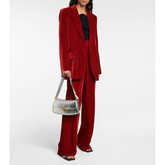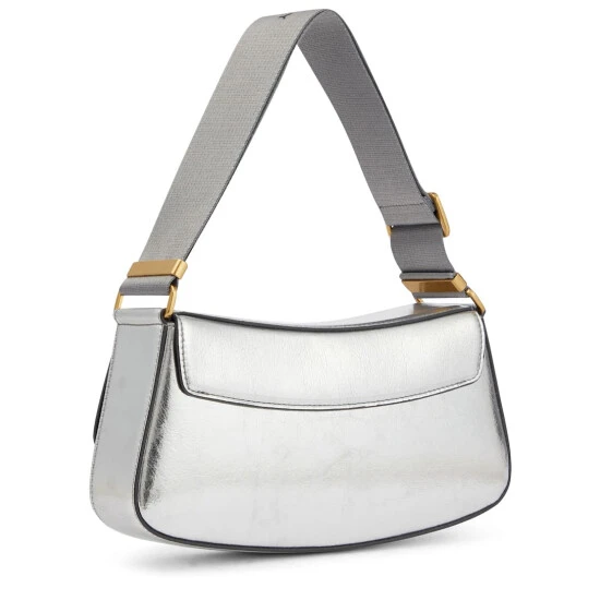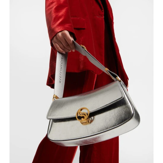 Stella McCartney’s S-Wave shoulder bag has a curved baguette shape. Made from the brand’s signature leather alternative called Alter Mat, this metallic design has a webbing strap and a gold-tone monogram plaque.
