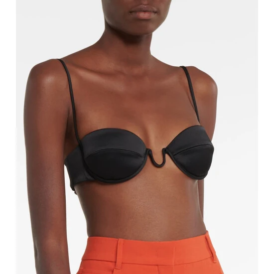 Crafted from panels of shiny black satin, this Stella McCartney bra features balconette cups designed to lift and enhance your curves. The style is finished with a sculptural element at the center of the bustline.