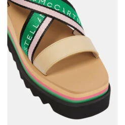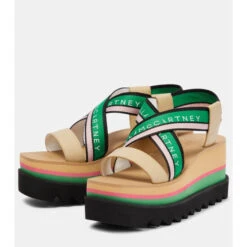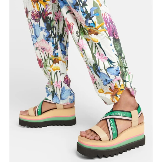 The Sneak-Elyse platform sandals from Stella McCartney are a sporty addition to your warm-weather footwear. They feature branded webbing straps, towering striped wedge heels, and saw-edge micro soles.